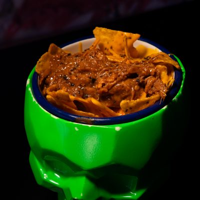 Price: 7 Menu: Entrantes Author: esteban Nachos cubiertos de pulled pork en barbacoa de jak Daniels y cheddar