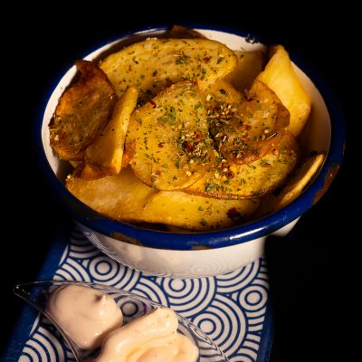 Patatas panaderas fritas con nuestro sazón. Puedes añadirle todos los extras que quieras !! Los puedes encontrar al final de la carta