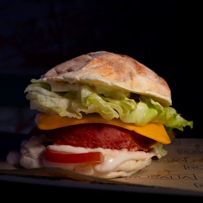 Hamburguesa 100% vegana, doble queso vegano, pepinillos encurtidos, cebolla y veganesa en un pan blanco de masa madre.